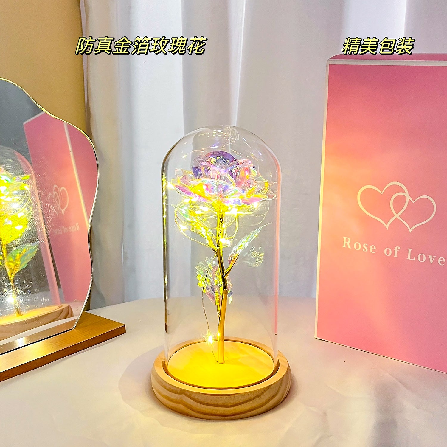 永生玫瑰花燈象徵著「永恆的愛與守護」,玻璃罩搭配暖光燈串